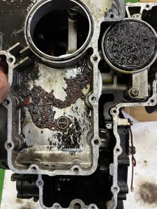 オイルパンを分解してみるとゴミがたくさん沈殿している状態。