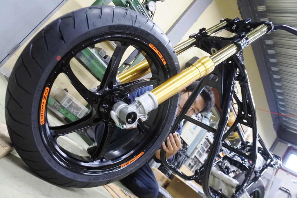 OHLINS製 正立フロントフォークはゴールドをチョイスし、ホイールは