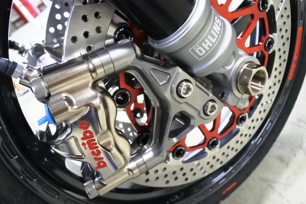 取り付けされた、Brembo製 CNCラジアルマウントキャリパー・・・