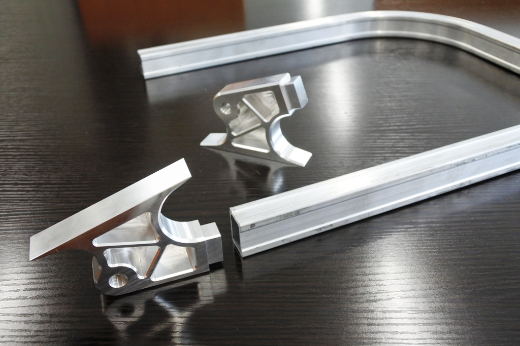 曲げ込まれたリブ角パイプに削り出し製作されたブロックピースが差し込まれ