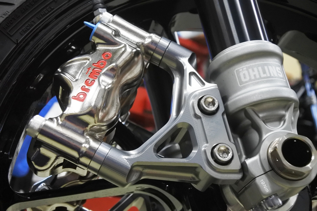 ブレーキキャリパーにはBrembo製 削り出しのラジアルマウントを採用・・・