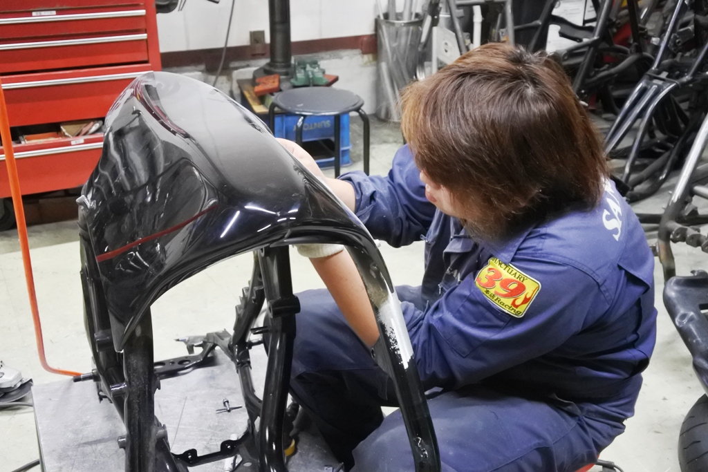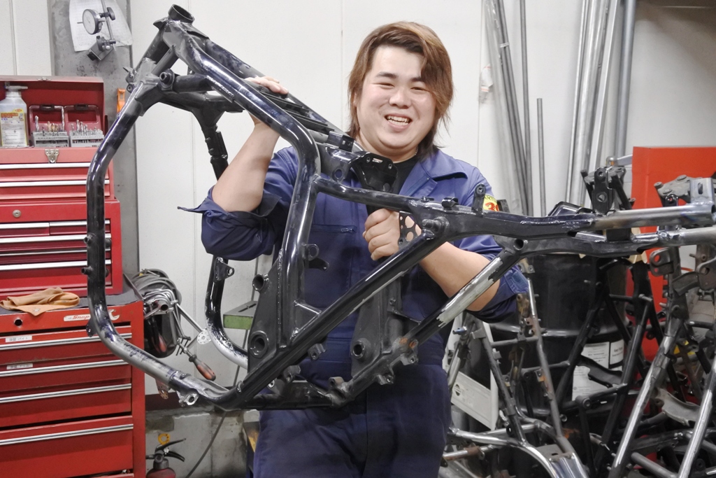 フレームをパウダーコーティングした後、車体を立ち上げ 組み立てて行く工程で