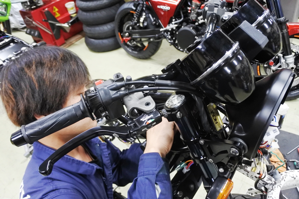 ハンドル上の装備、スロットルや左右スイツチを本固定し、Brembo製ラジアルポンプ