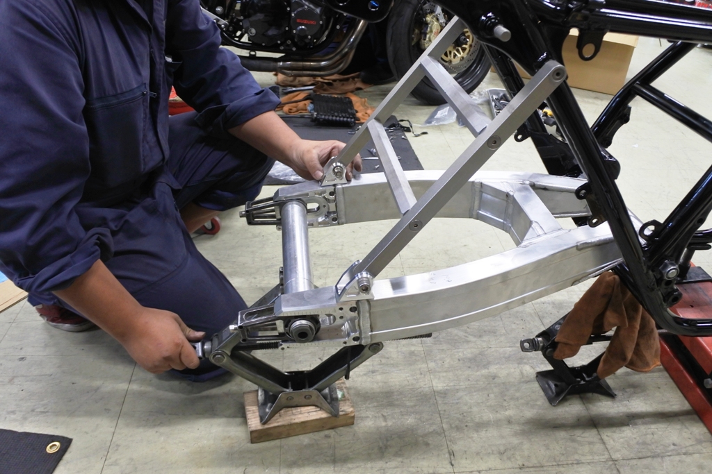 スイングアームがブラックコーティングから戻って、早速フレームに取り付けされ