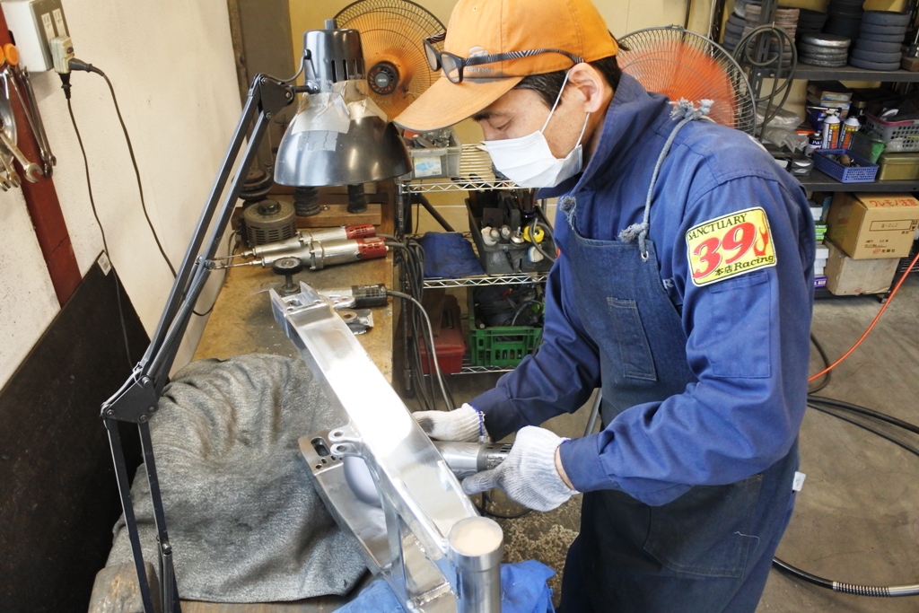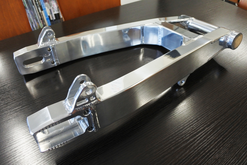 いつまでも仮組みスイングアームでは 心もとないので、バフ研磨部門の菊地に頼み