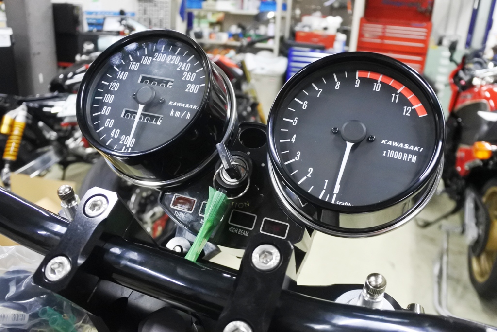 メーターはカワサキ純正品を専門業者さんにフルリビルドして頂いたもの・・・