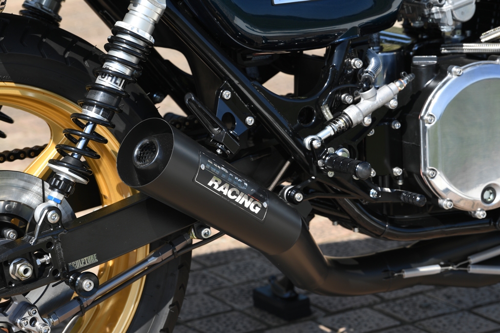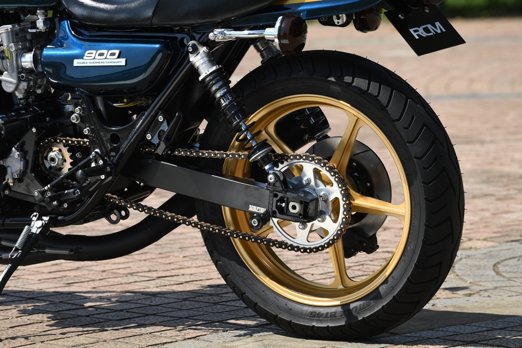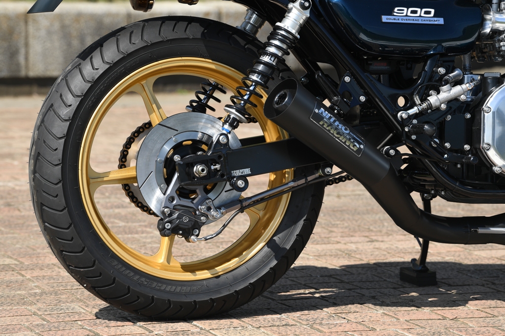だからSCULPTURE製18インチホイール専用スイングアームも 少し幅広の