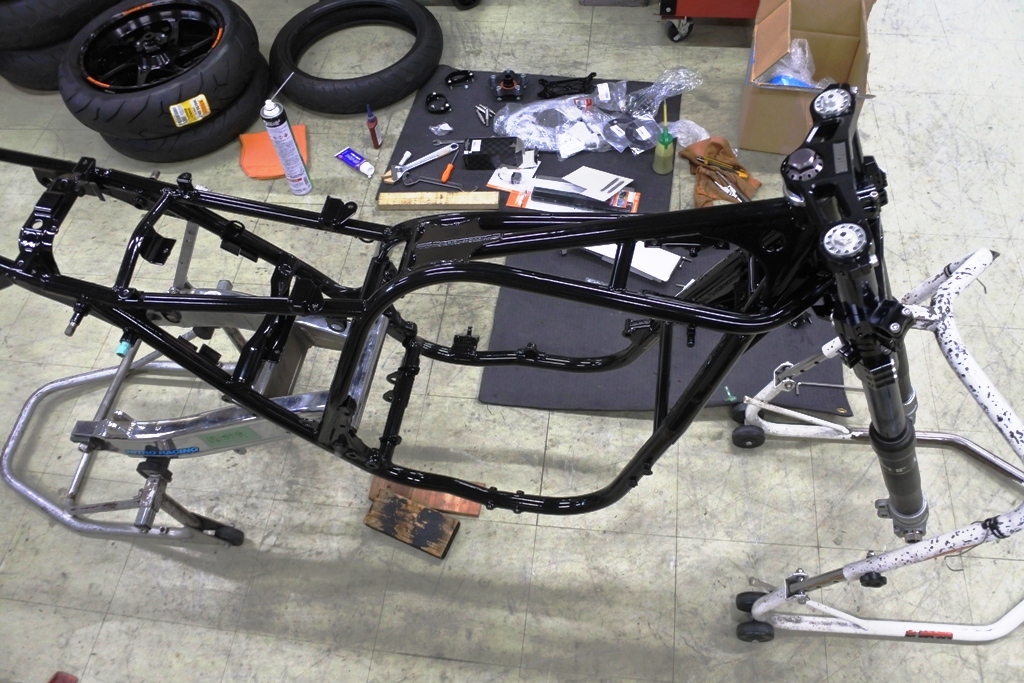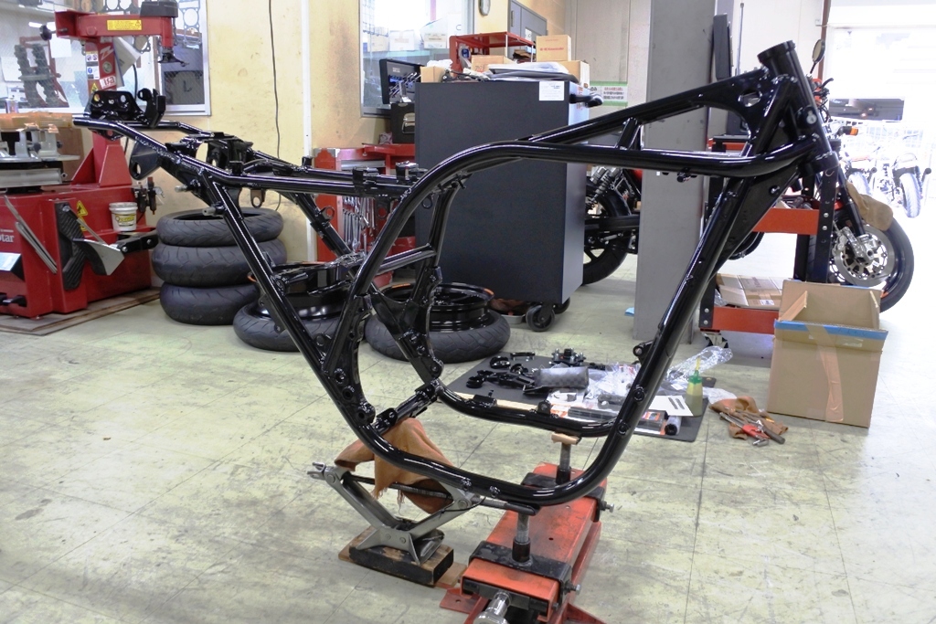 フレームがパウダーコートから戻って来たので これより車体の立ち上げに。