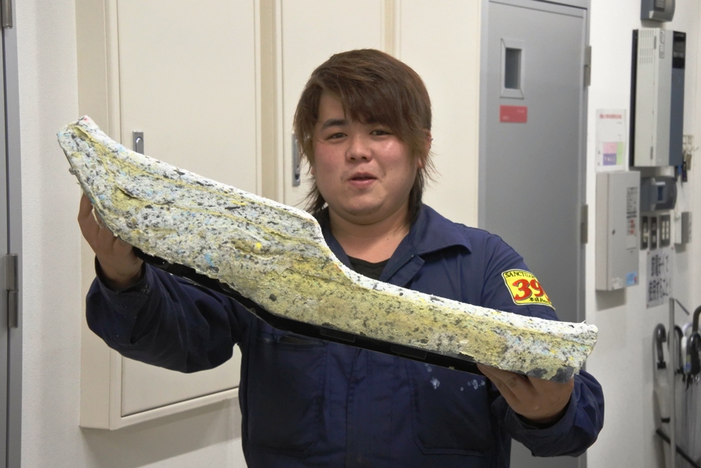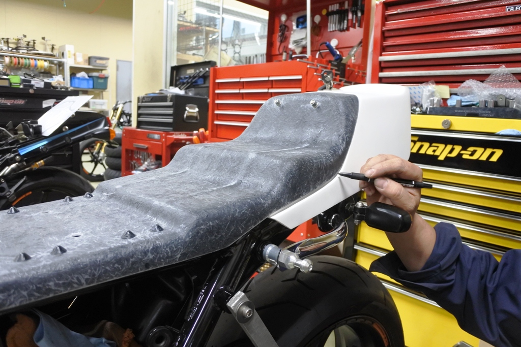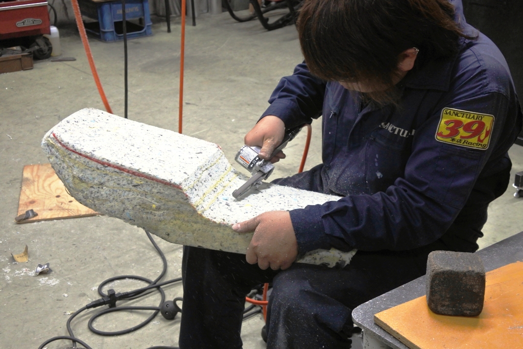 実際に車両に取り付け シートベースのファイバー形状を整えると言う作業が