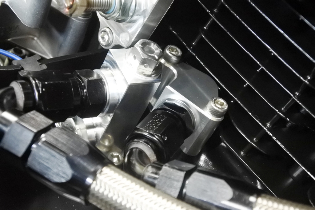 ナイトロレーシング製 ビレットオイルラインアダプターに、EARLSホース