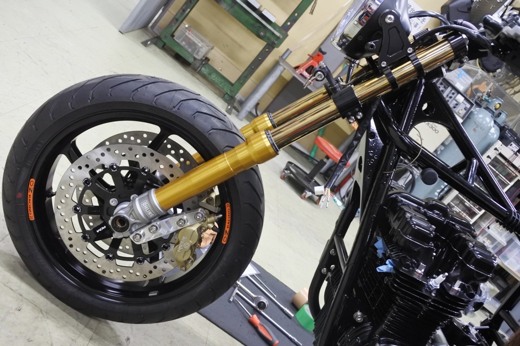 H・Tさんの希望で OHLINS正立フロントフォークをゴールドに変更。