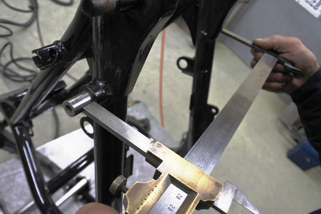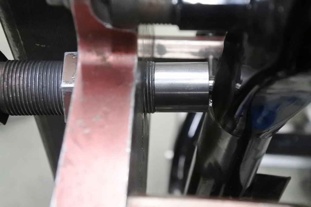新しいレイダウンブッシュを挿入し、リアサスのオフセット値を測定。