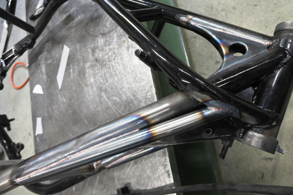 ヘッドパイプ下の補強パイプをエンジンマウント近くまで持って来る事と
