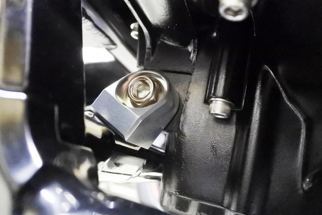 エンジンハンガーにカラーを介さず、クランクケース幅とほぼ同寸の短いボルトで