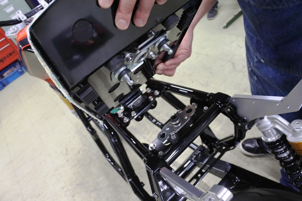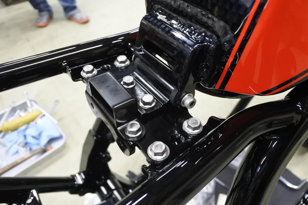 既にフレーム側には これまたワンオフ製作したマウント部が設けられており