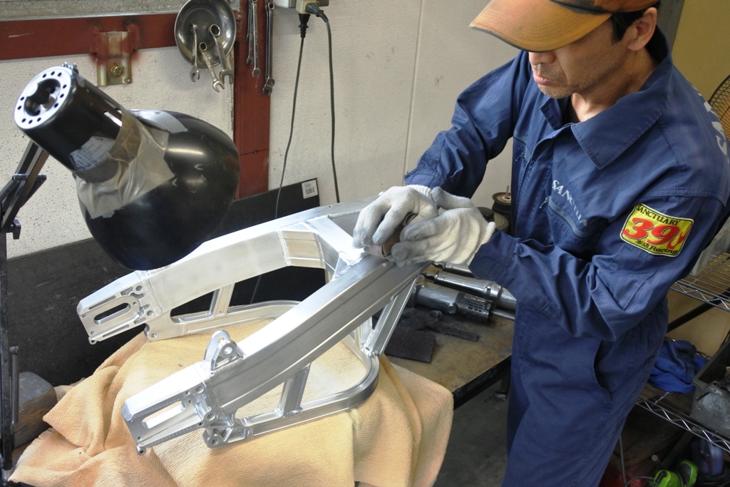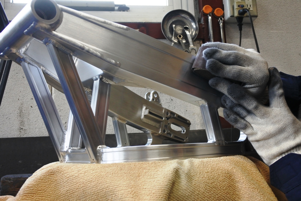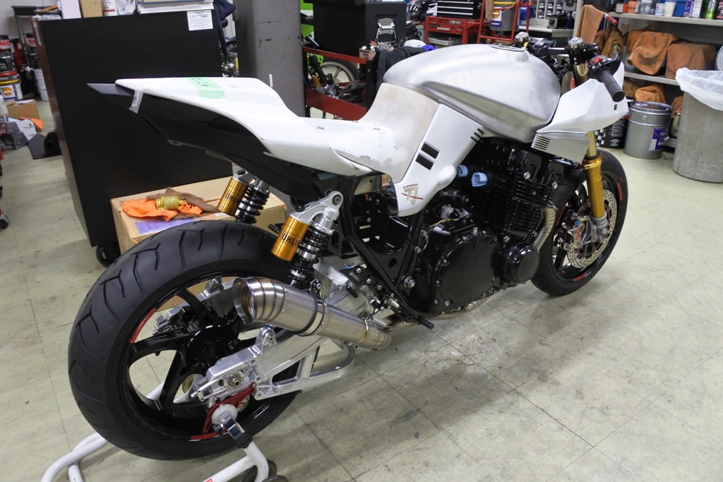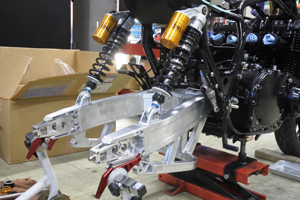 Even though the rear suspension is still a provisional one, a swing arm with completed surface treatment was mounted.