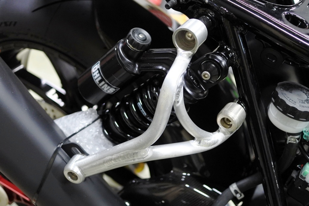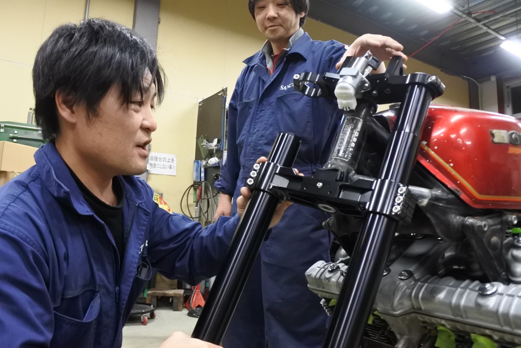 ここでいきなりOHLINSユニバーサル倒立フォークを取り付けしてるのは